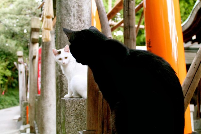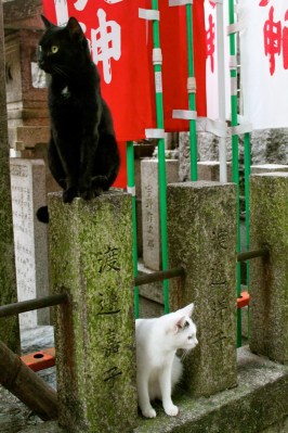 A pleasant little surprise was the amount of kittens running around different parts of the shrine. Some of them were a bit skittish, but these two hairballs below hung out for a while; guarding their portion of the shrine.