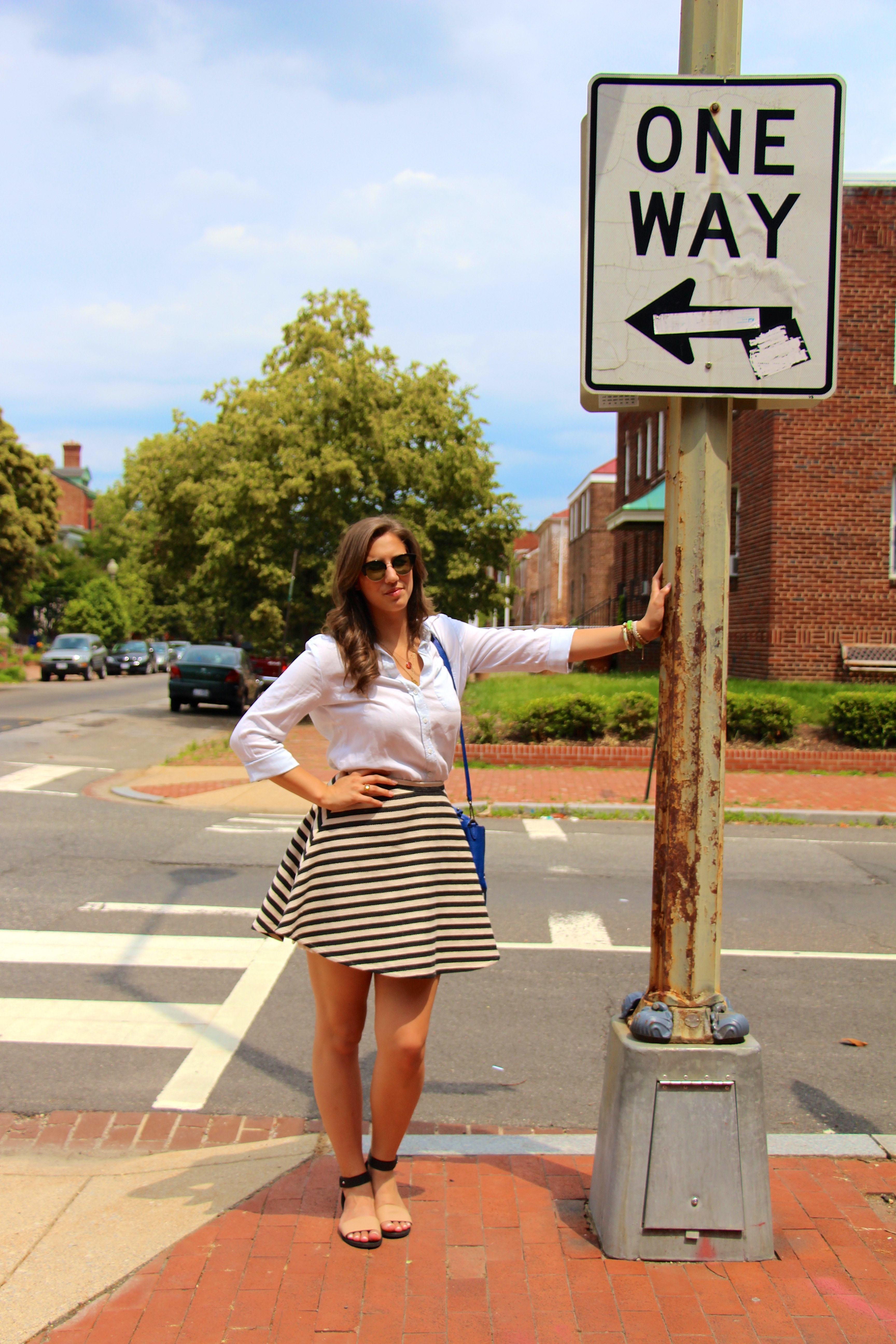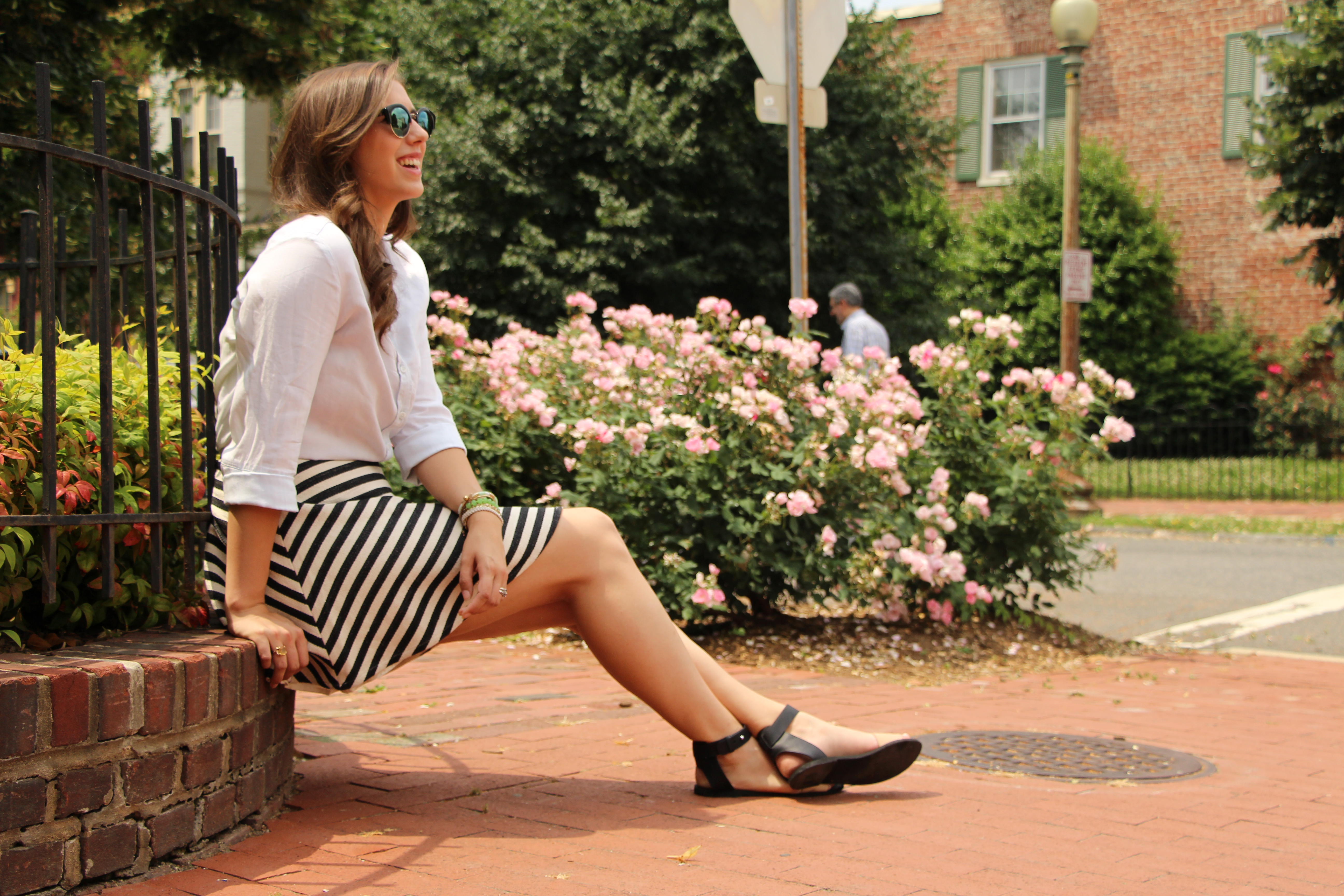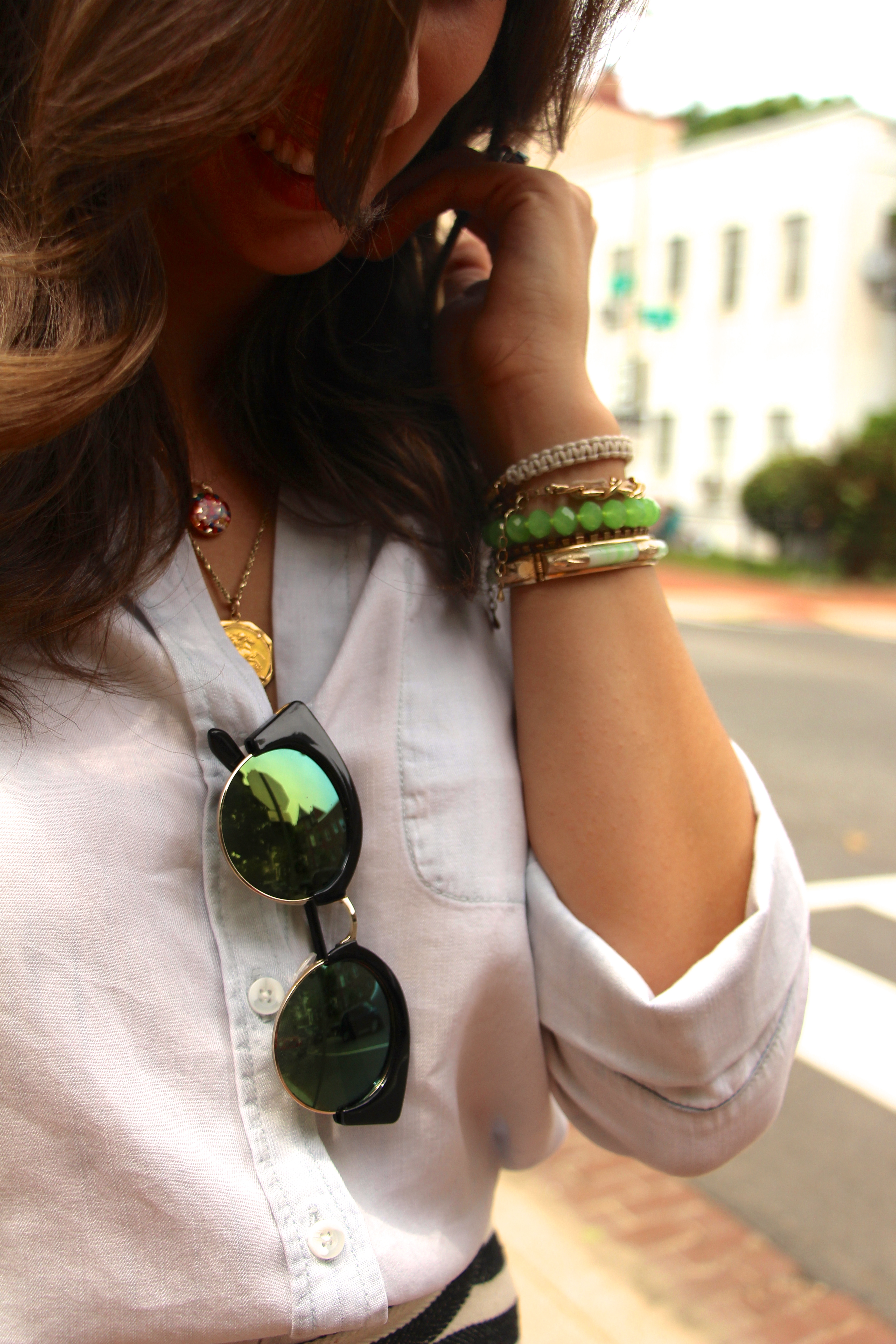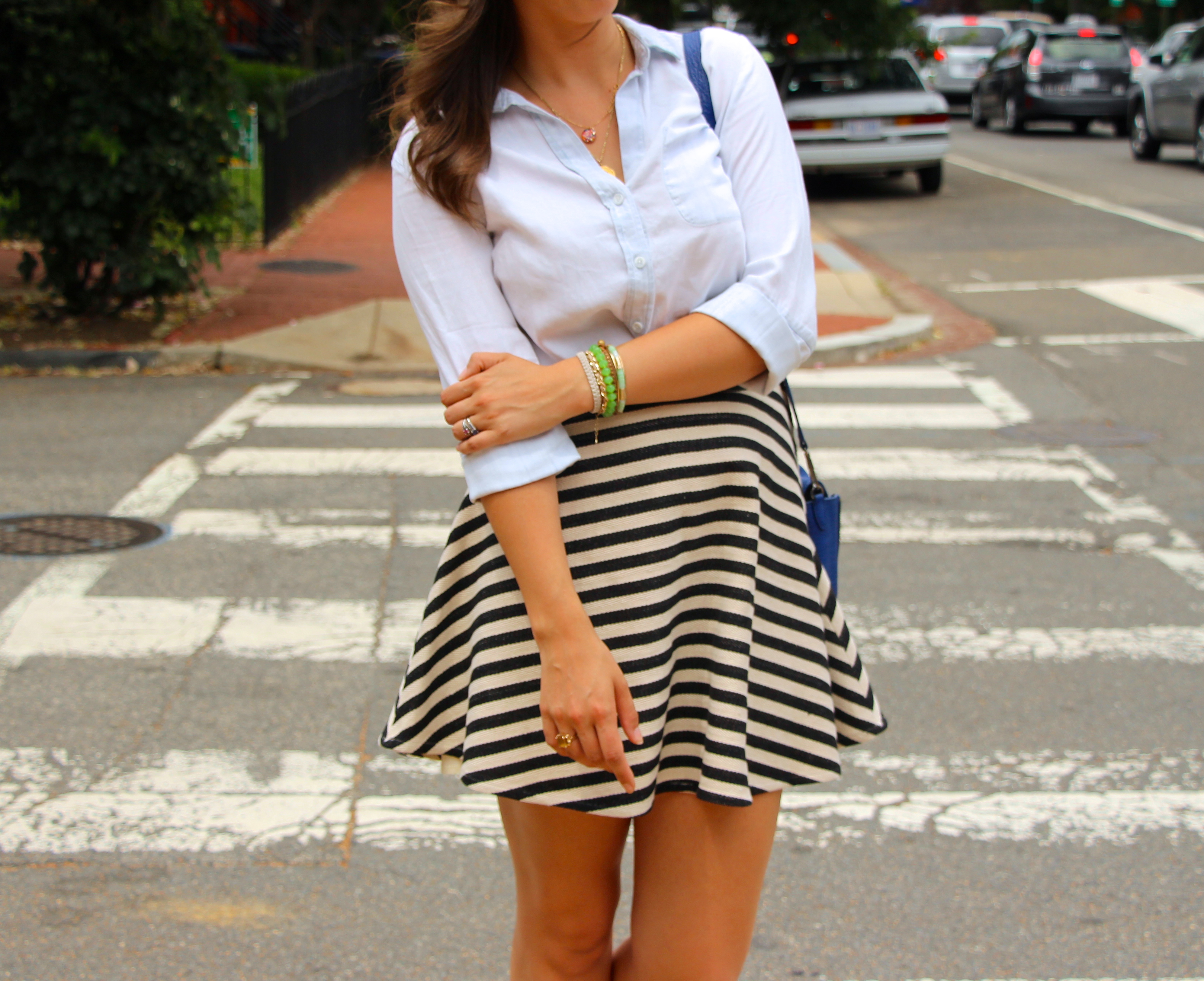 It was a little toasty in DC today, so I decided to keep it light with a chambray top and a swing skirt. I paired it with my new Vince sandals, which are the comfiest shoes I own. And, because of the black and nude, they go with everything! I also picked up some jewelry from a local jeweler, Diament, yesterday at the DC Meet Market. It was tough to pick a couple of pieces because everything was so cute! Definitely worth checking out their stuff!