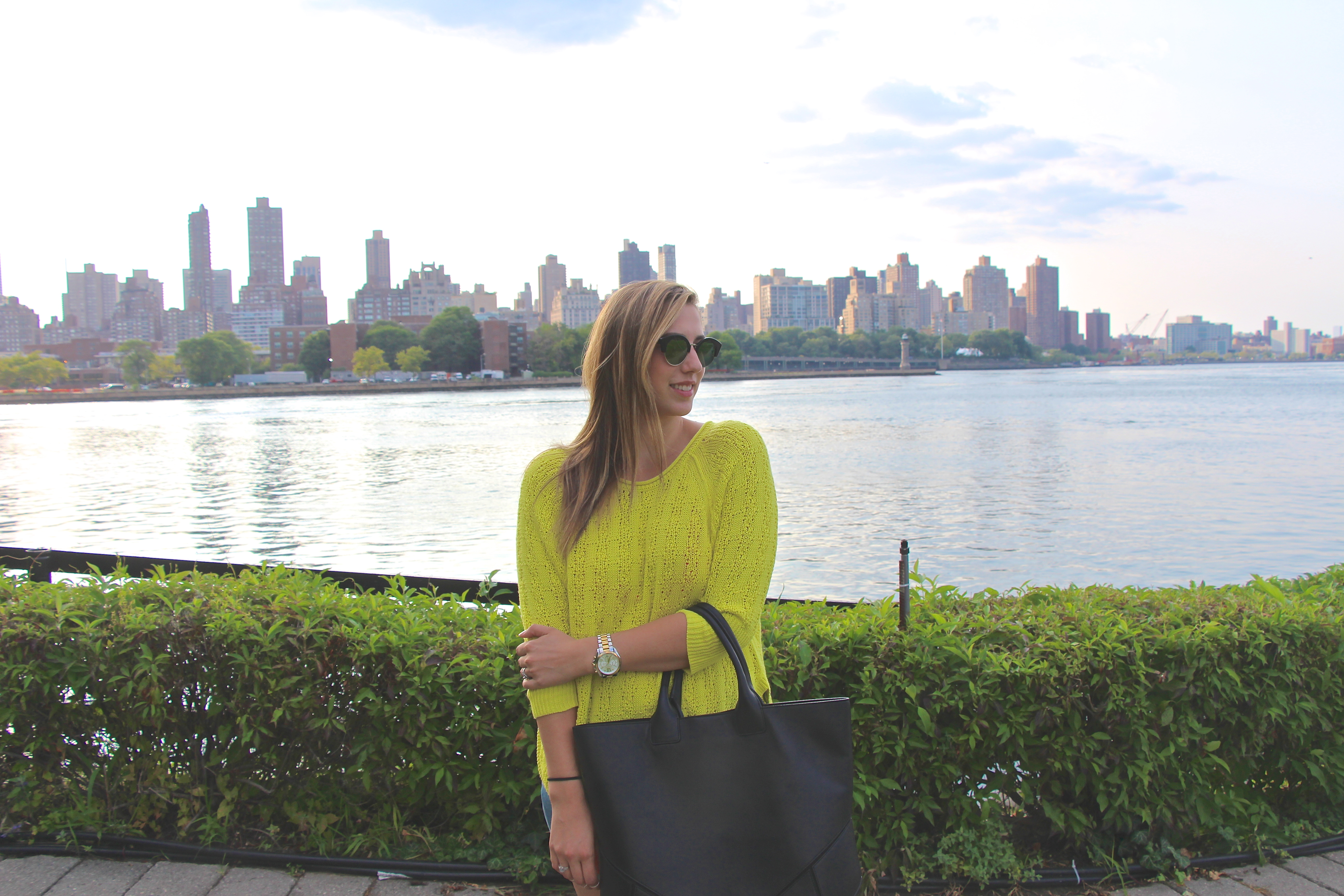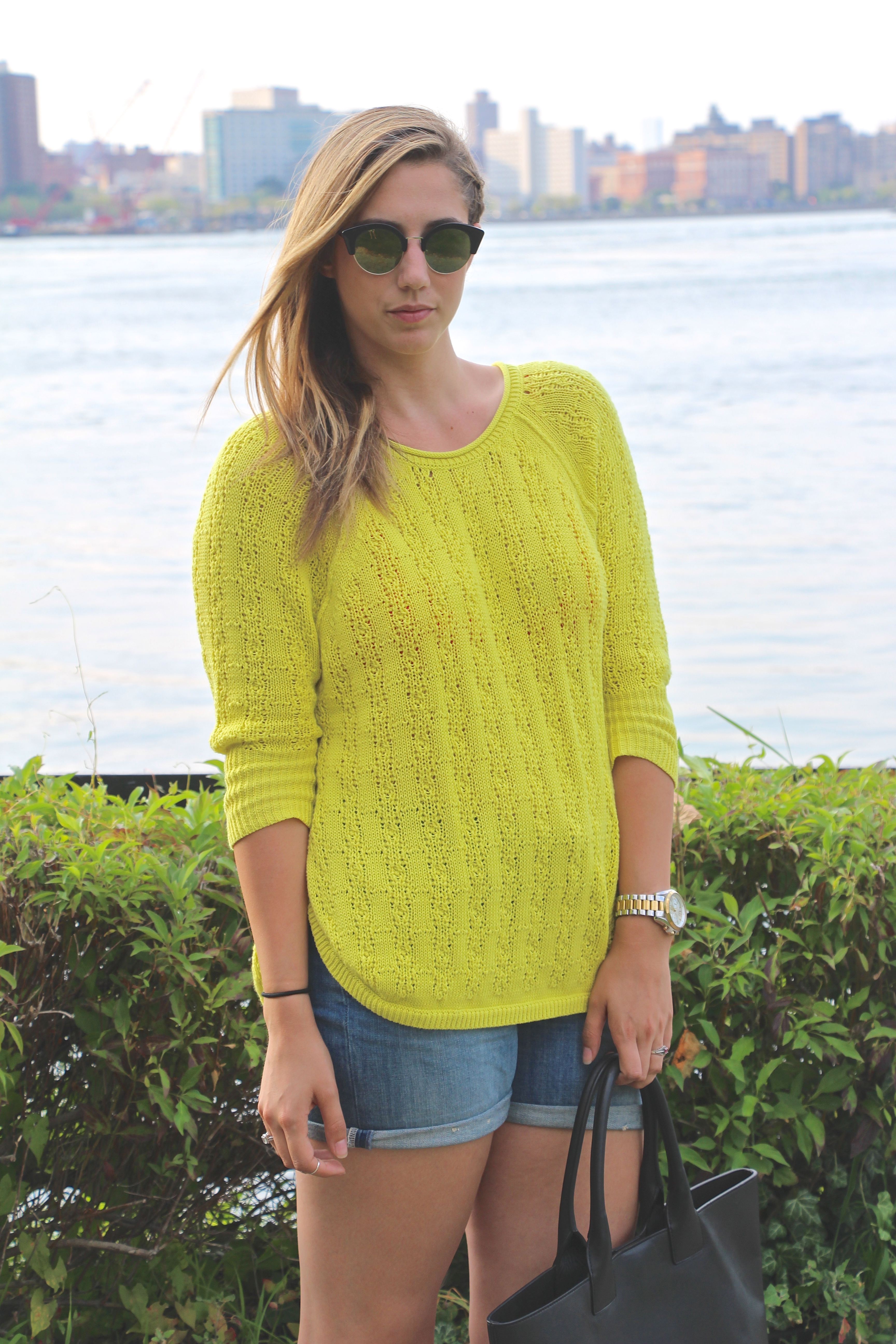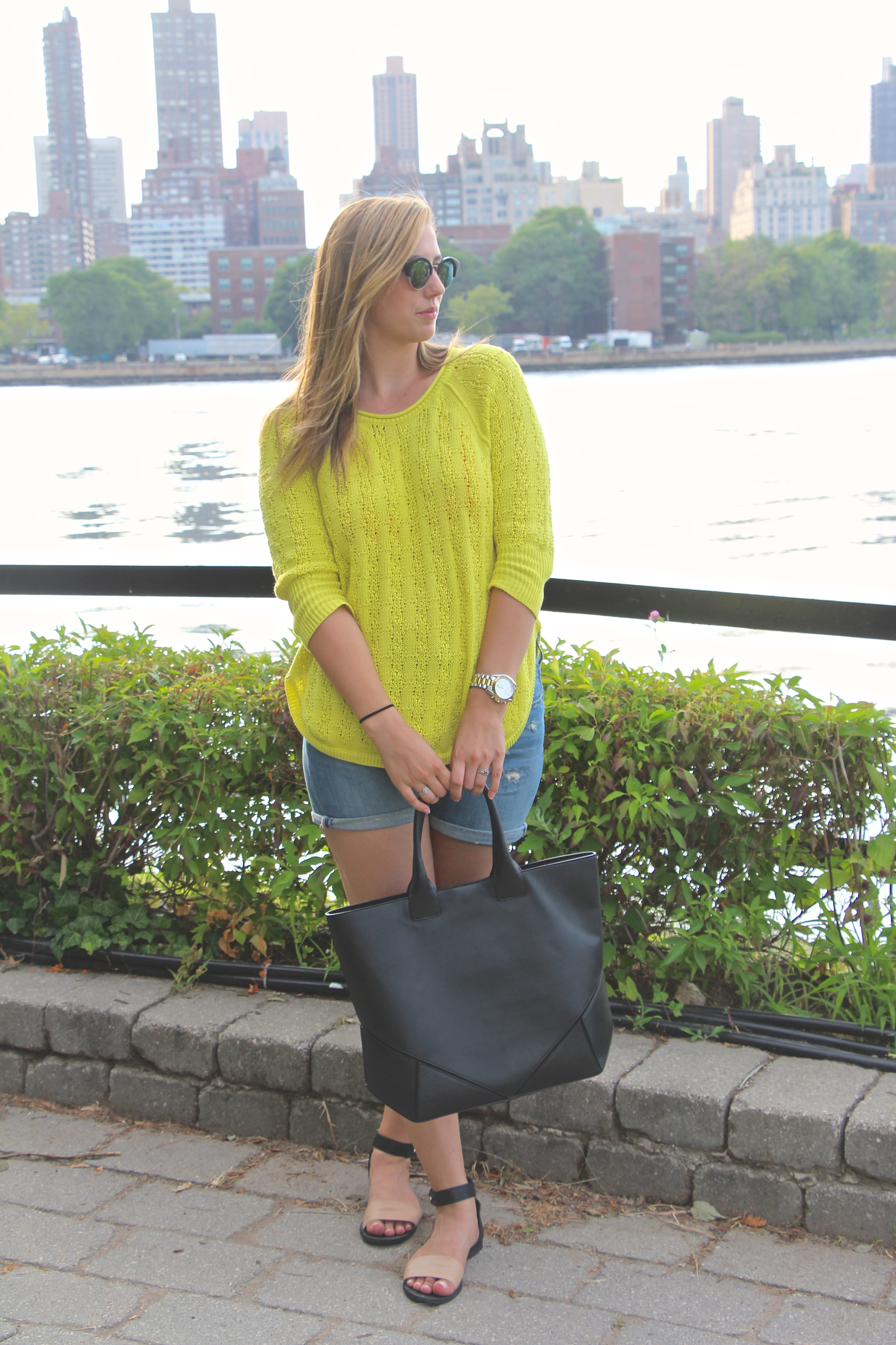 Whenever I head across the East River, casual is the name of the game — meaning denim shorts and bright colors! I snagged this chunky, yellow sweater on sale, which has turned out to be one of my go to knits this summer. To add a touch of Manhattan, I completed the outfit with crisp, black accessories that give the look a little bit of edge. This Givency tote holds everything I need for work from my MacBook Air to my DSLR camera, meaning it’s fashionable and funcitonal. Does it get much better?