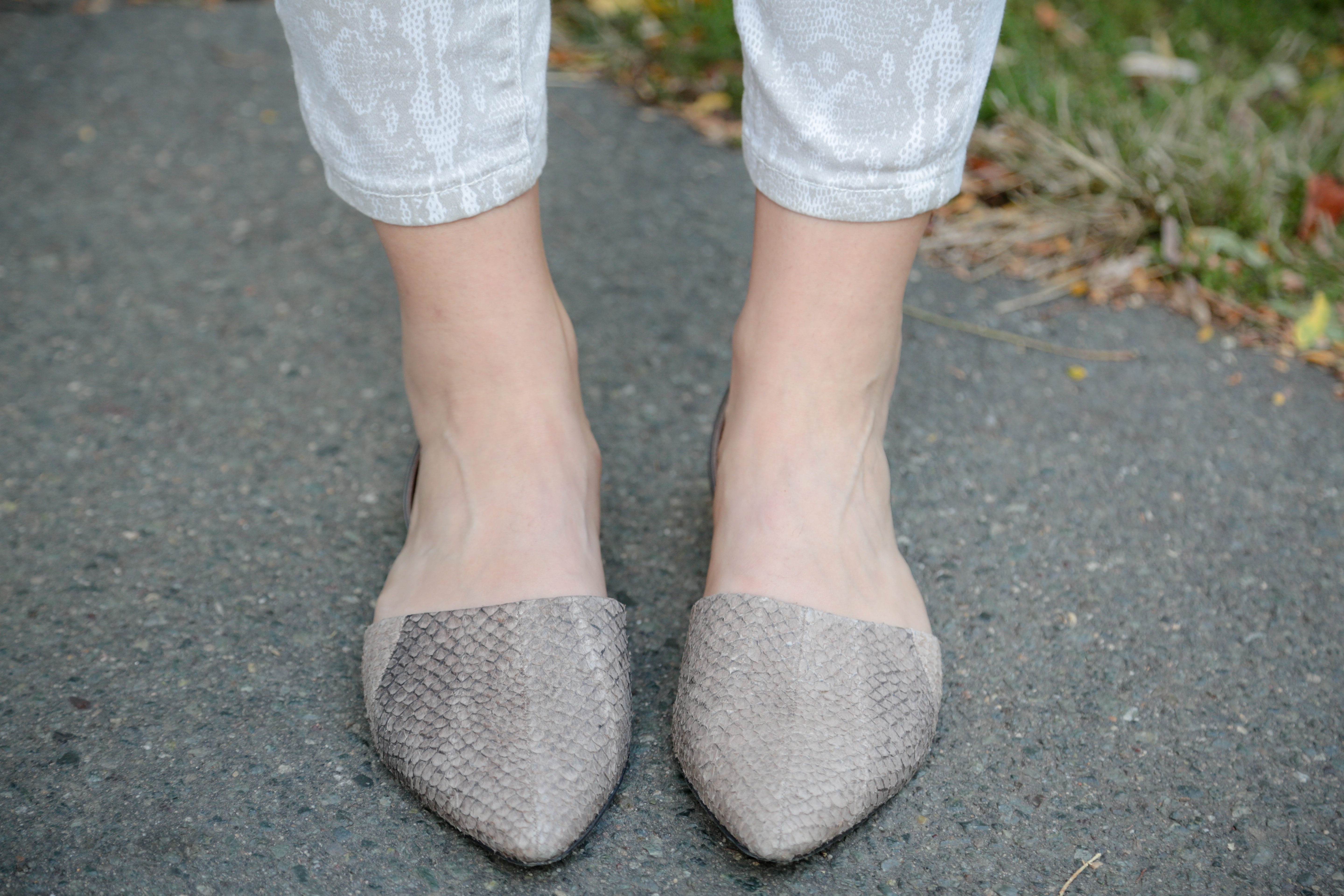 Sweaters can often become redundant and look a lot alike, so I try to find pieces that have something a little quirky or different about them. This one I’m wearing happens to have a massive collar, adding a little drama to an otherwise underwhelming sweatercoat. Instead of dark skinny jeans and boots, I kept it light with neutrals in white, tan and taupe. I’m not usually one to rock a full neutral look without a little flair, and you can see, I’ve pulled pieces that have a pattern and topped the look off with a pop of color for good measure.