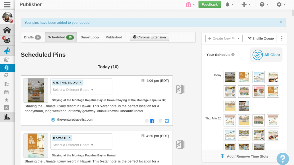 So, what makes Tailwind so great? It allows your to batch schedule pins to multiple boards at once, and the platform publishes your pins for you at optimal times to ensure as many eyeballs on each pin as possible. It is infinitely more efficient than pining in real-time, and you can easily A/B test your pins by changing just the image, title, or description, and keeping all other elements the same. Tailwind is also a collaborative tool. You can create “Tribes” where you can invite fellow small business owners, or thought leaders in your industry, to cross-promote each other’s content, ensuring even larger reach.