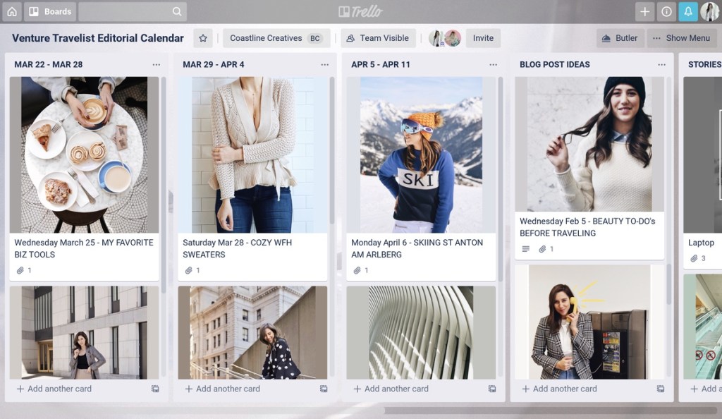 Oh how I love Trello. It is by far my favorite business tool, and I’ve been using it for 5+ years. Probably the reason why I rave about this platform the most is because it is highly versatile; the number of use cases continue to grow as my business evolves and I look for solutions for new roadblocks that I approach as my business scales. I use it as an editorial calendar for personal channels as well as my client’s social media channels, a CRM tool or pitch tracker (that is mutually accessible by my team and the influencers we manage), an internal project management tool, and at it’s most rudimentary level, a to-do list.