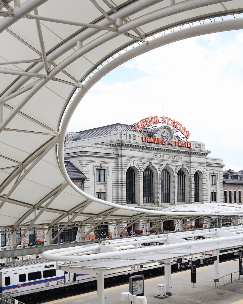 Denver’s most iconic historical landmark is flanked by modern architecture creating an intriguing contrast between old & new. I took this shot from a set of stairs leading down to the platforms; the staircase with the white archway also make for a cool backdrop.